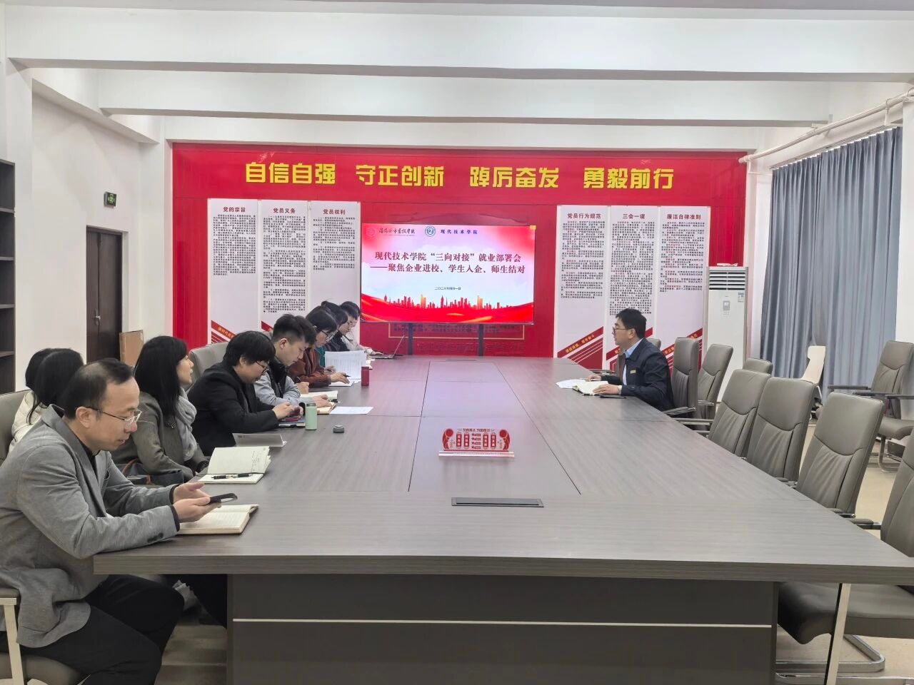 为进一步做好毕业生就业服务工作,搭建校企合作桥梁,4月1日,现代技术学院在业精楼D510会议室召开“三向对接”就业工作部署会。会议聚焦“企业进校、学生入企、师生结对”三大方向,旨在通过精准对接、全程服务,全力促进毕业生高质量就业。学院党总支书记朱帅主持会议,全体教师参加会议。