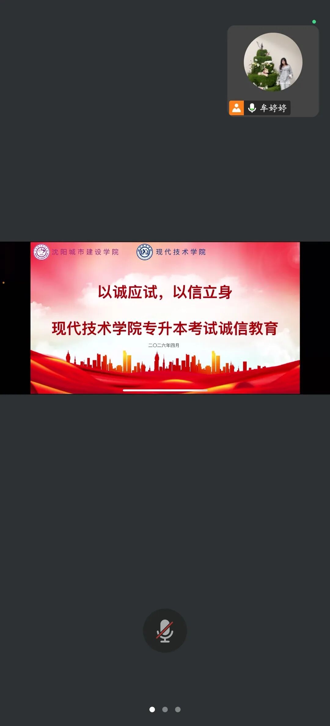 4月15日,距离2026年专升本公共课考试仅剩三天。为严肃考风考纪,引导毕业生以诚信姿态迎接考试,现代技术学院通过线上腾讯会议召开专升本考试诚信教育专题会议。毕业班辅导员及全体专升本毕业班学生参会,会议由毕业班辅导员牟婷婷主讲。