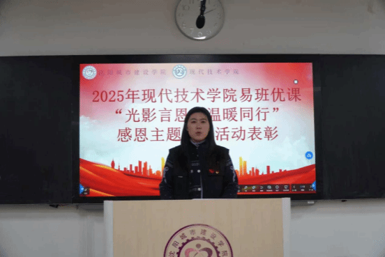 为深入推进感恩教育,营造温馨向上的校园文化氛围,现代技术学院易班学生分站于12月9日在业精楼B404教室举行“光影言恩·温暖同行”易班优课主题活动表彰会,对在本次主题创作活动中表现突出的同学进行集中表彰。学院相关负责教师及易班学生分站全体成员、获奖学生代表共同参加了本次活动。